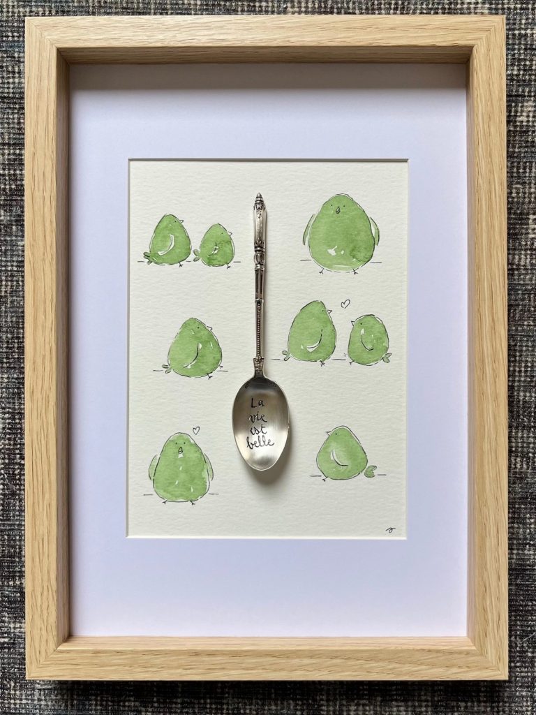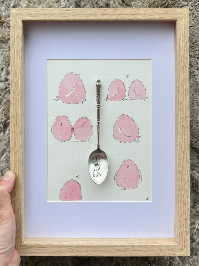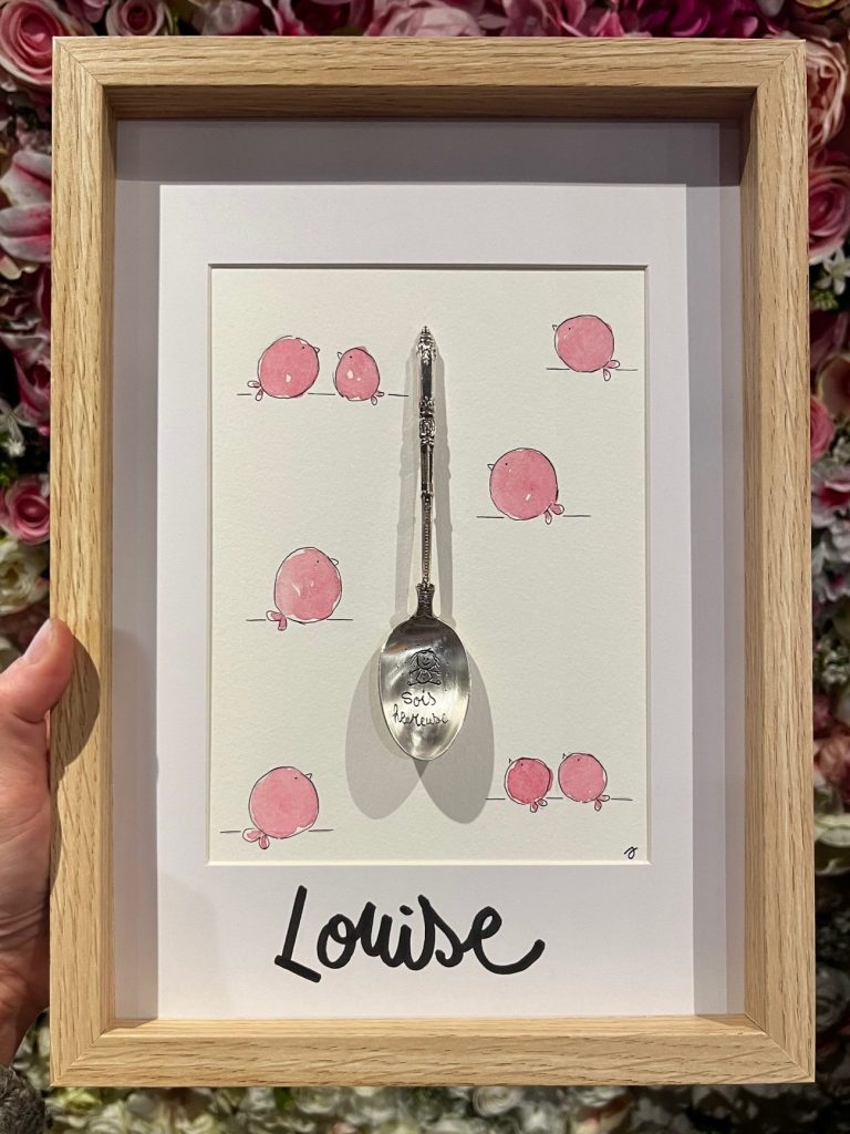 Une cuillère en argent, gravée avec soin, à la main, par la Maison Princesse ficelle, et maintenue sur l'œuvre avec une colle résistante