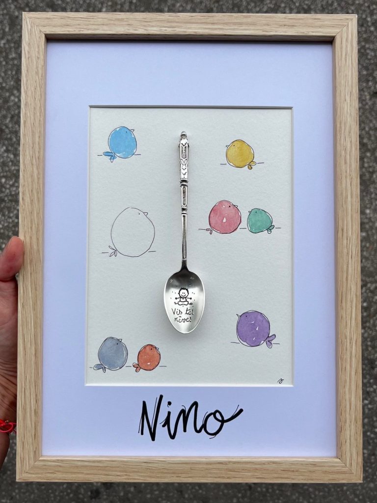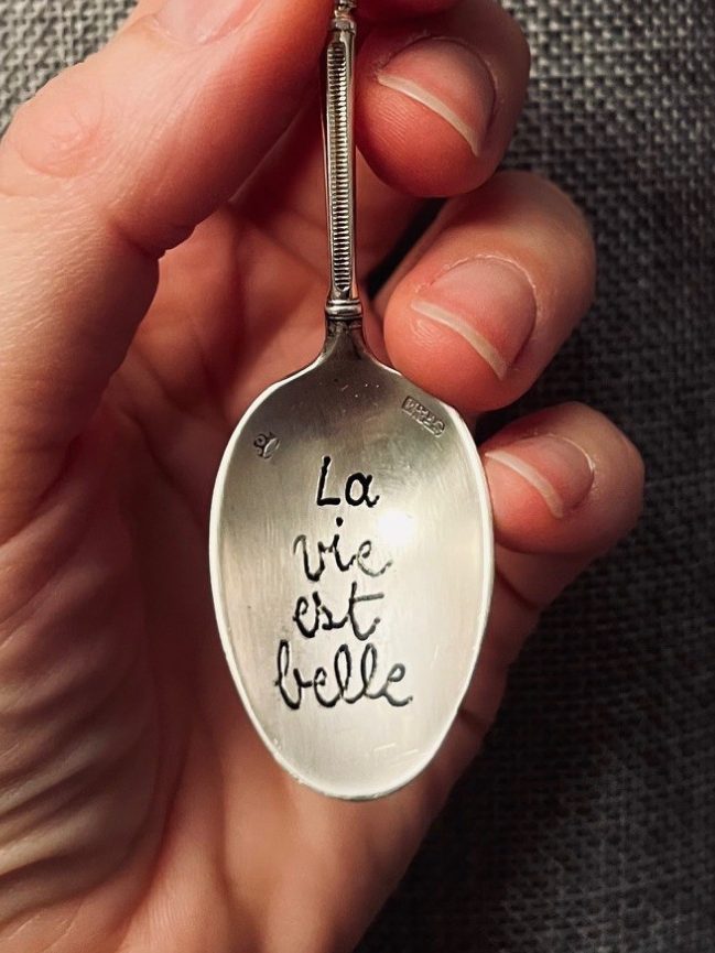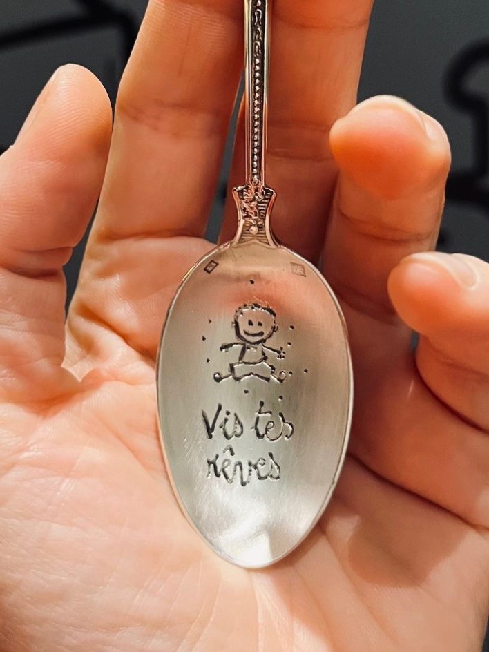 Une cuillère en argent, gravée avec soin, à la main, par la Maison Princesse ficelle, et maintenue sur l'œuvre avec une colle résistante